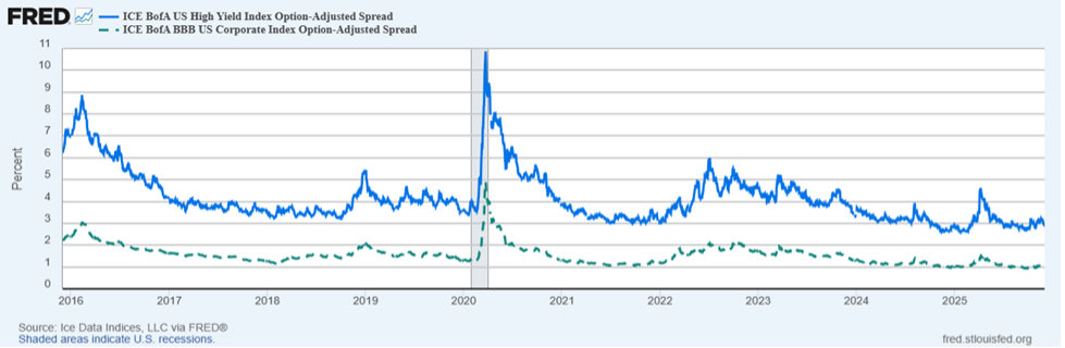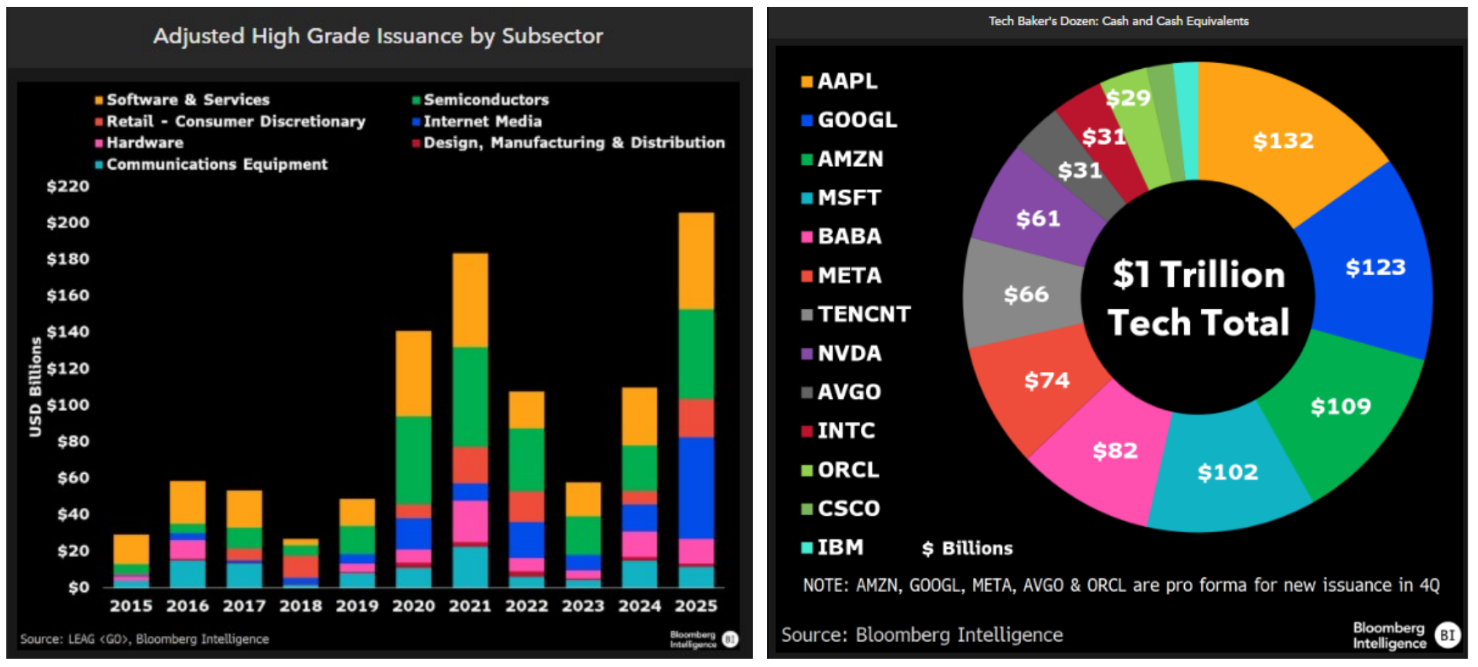 2025 has been a banner year for new issuance, as many high-grade technology companies have rushed to the market to issue bonds to help fund AI initiatives, cloud infrastructure, and data center expansion. Companies such as Meta, Google, and Amazon have all tapped the bond market this year to support their financing needs. Although this wave of issuance has raised concerns for some investors, overall credit metrics for high-grade issuers remain solid as the biggest issuers of debt have both the balance sheet strength and the cash flow to support financing costs. The greater risk appears to be potential credit-rating downgrades rather than any meaningful risk of default. Tech companies collectively hold more than a trillion dollars in cash, providing ample liquidity. This can be seen as a bullish signal, suggesting that continued investment may have a positive impact on the broader economy.