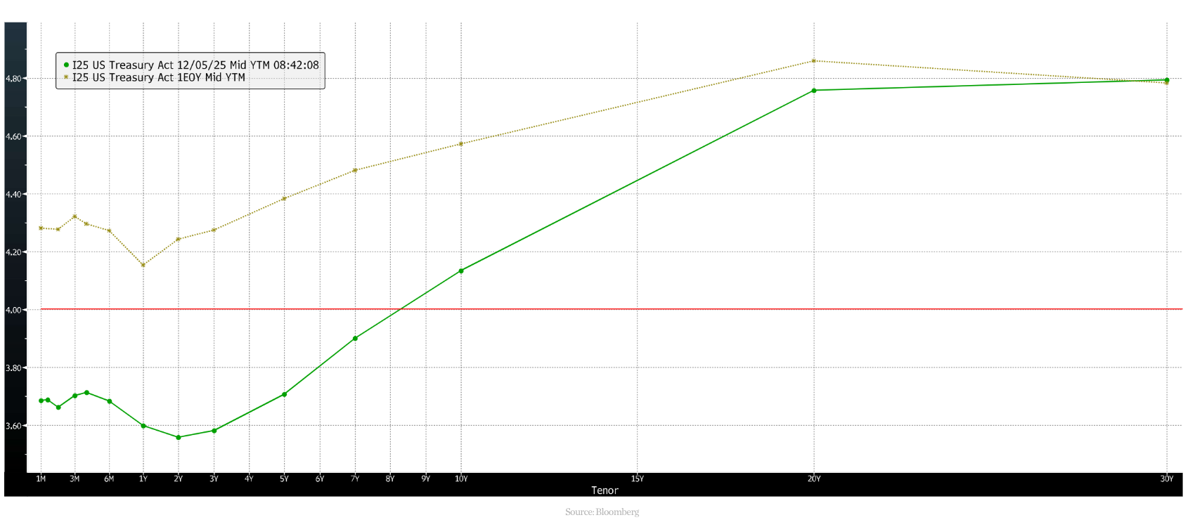 We continue to believe it is a good time to lock in rates, as yields may move lower in the new year. The front end of the yield curve could decline further if the Fed cuts rates or if the market begins to price in additional easing. Should economic conditions deteriorate, longer-term rates could also fall below 4%. We saw this briefly with the 10-year Treasury before it subsequently recovered. Locking in rates now can help protect portfolios against future declines in yield.