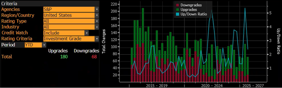 It is important for fixed income investors to perform regular “maintenance checks” on their holdings and review the quality metrics of the companies they own. Most bonds carry a credit rating issued by agencies such as S&P or Moody’s – where high-grade ratings range from AAA/BBB to Aaa/Baa. Generally, credit metrics have remained stable in the investment-grade bond market. This year, upgrades have outpaced downgrades from both agencies. If we see an uptick in ratings downgrades or revised negative outlooks, it may signal that we are entering a tougher economic environment, although we believe this to be highly unlikely.