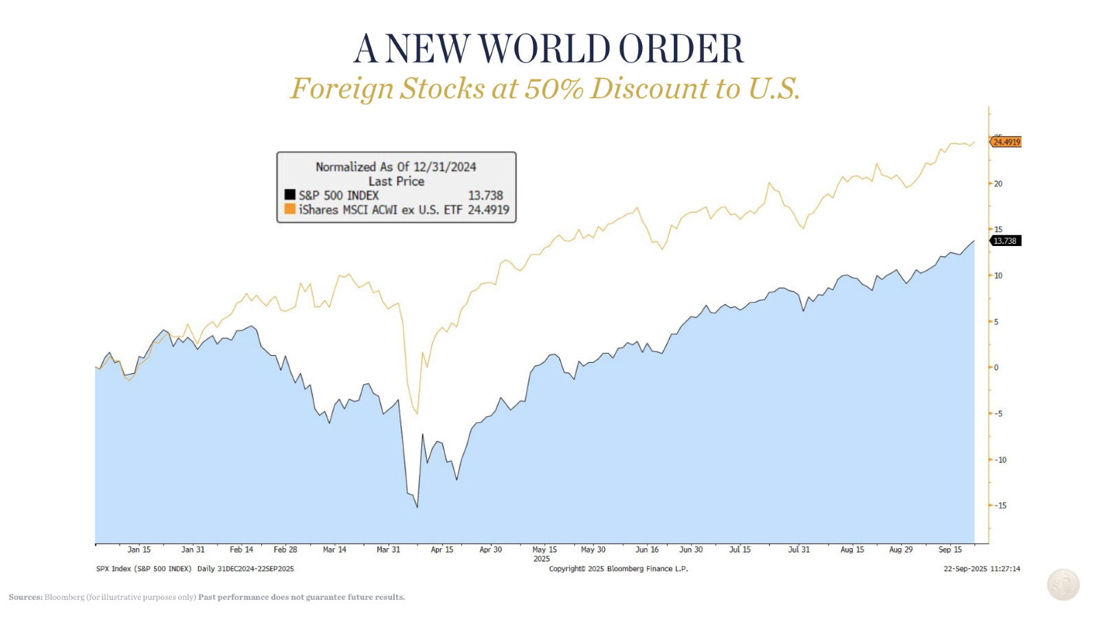 For the first time in over 15 years, foreign stocks are outperforming US indexes – and by a wide margin. Much of this is related to the “New World Order” of the US administration. The US global economic policies are significantly benefiting foreign economies and financial markets. As the US withdraws foreign funding and financial support, these regions are taking a page from “The Great American Playbook” by significantly increasing fiscal spending and easing monetary policy. Foreign economies are now gaining strength, and markets are reacting. This year alone foreign market performance has surpassed that of US market indexes, and we believe this will be the case for a number of years to come. Given that foreign markets have been neglected for many years, stocks are very undervalued and most global investors are extremely under-allocated. This combination of strong economic fundamentals, solid performance, and bargain stock prices is likely to create a buying spree in foreign stocks over the next few years. Hence our significant exposure to international stocks in your portfolio.