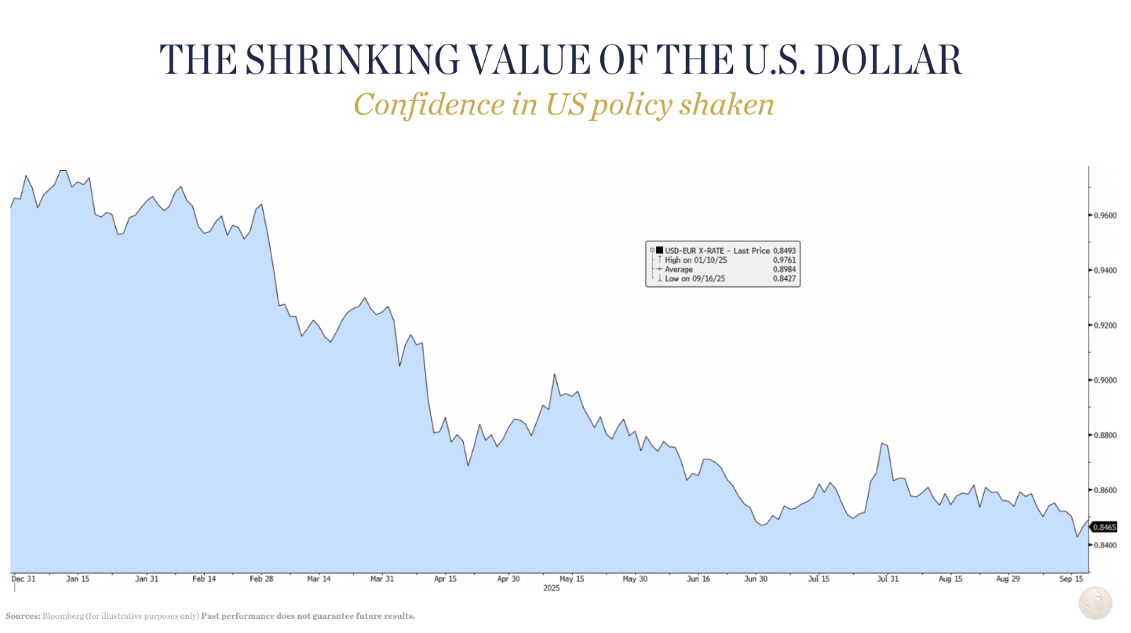 The US dollar’s decline this year is the worst since 1981! This decline is tied to the significant changes due to the “New World Order” economic policy and the declining level of foreign confidence in the US as the most “exceptional” global economy. The Federal Reserve’s lower rate policy will likely create more headwinds for the value of the dollar. Since we are diversified in non-US-dollar-denominated foreign stocks, we are mitigating this risk.